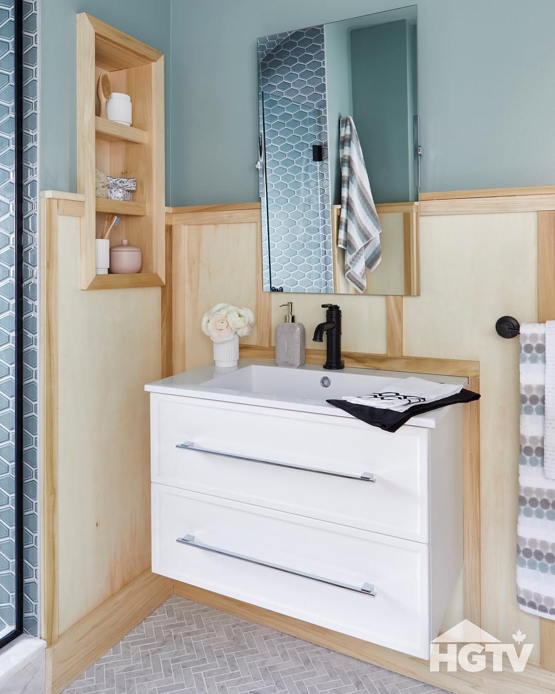 The goal was to maximize space in this small bathroom reno. HGTV Canada’s Save My Reno used Cutler’s 30" Milano Floating White Vanity to add storage and function to this small space