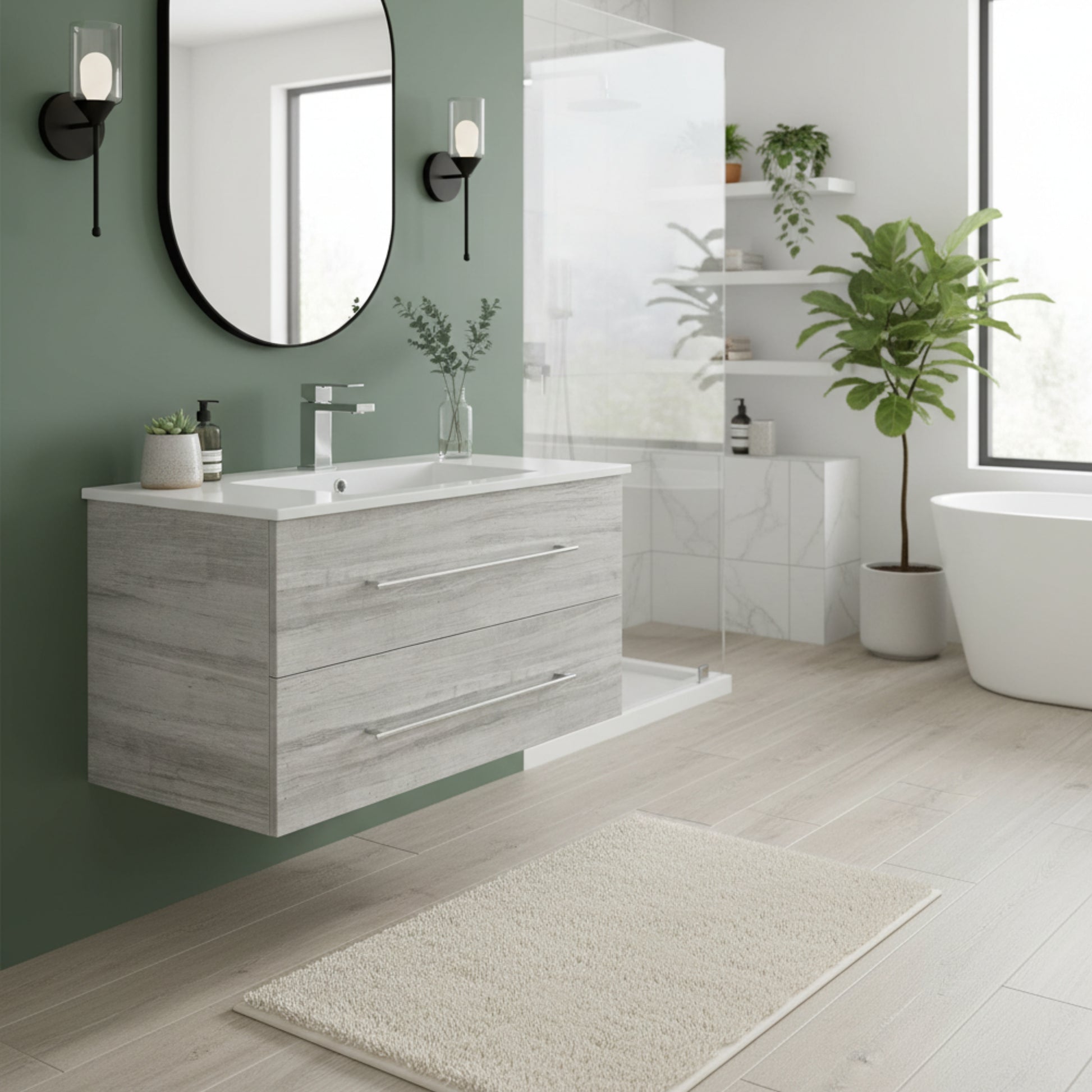 Enhance your bathroom design with the minimalist yet practical Kato 36-inch Floating Vanity by Cutler Kitchen and Bath. A stylish and functional solution for modern spaces. This small bathroom vanity is designed to maximize storage while maintaining a sleek, contemporary aesthetic. The vanity sinks for bathrooms feature a durable cultured marble top with an integrated rectangular sink and overflow for worry-free use. Its soft-close drawer system offers smooth and quiet operation while keeping bathroom essentials neatly organized. The floating wall-mounted design frees up floor space, making smaller bathrooms feel more open and easier to maintain. Crafted in Canada, this vanity reflects high standards of cabinetry and woodworking, ensuring strength, durability, and style. It features a white countertop that creates a striking visual contrast to enhance any modern bathroom. Whether you are updating a guest bathroom or planning a sleek primary bath, this wall mounted bathroom vanity offers the perfect balance of durability, storage, and contemporary design.