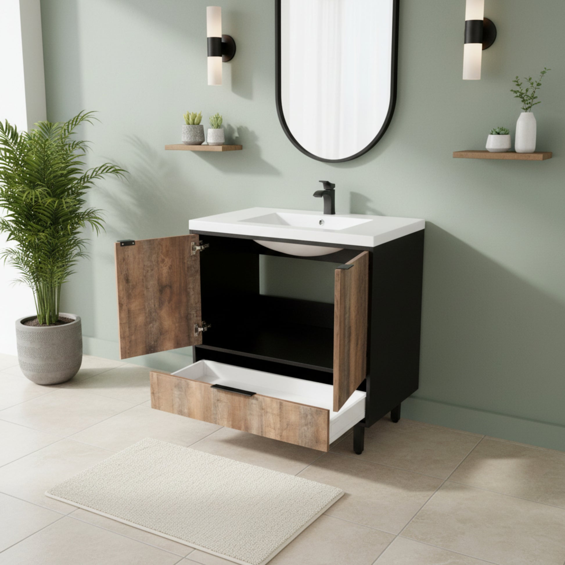 - SOFT-CLOSE DOOR & DRAWER SYSTEM: This modern vanity features smooth-operating soft-closing doors and drawers that prevent slamming, extend cabinet life, and provide quiet, reliable storage for daily essentials