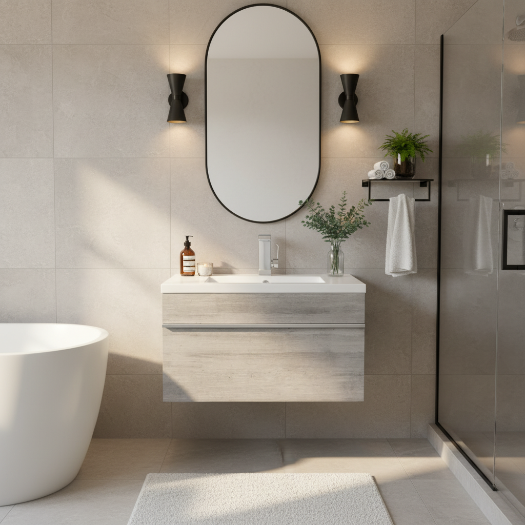 - MODERN FLOATING DESIGN: The sleek 24 inch vanity with sink wall-mounted design keeps the floor open and easy to clean, creating a contemporary aesthetic while saving space in standard bathrooms